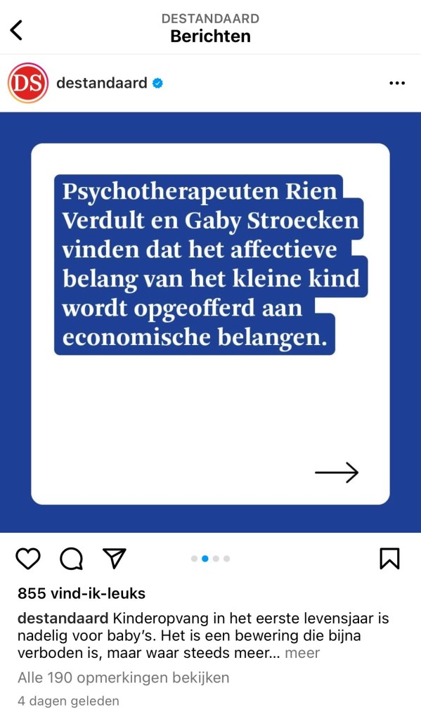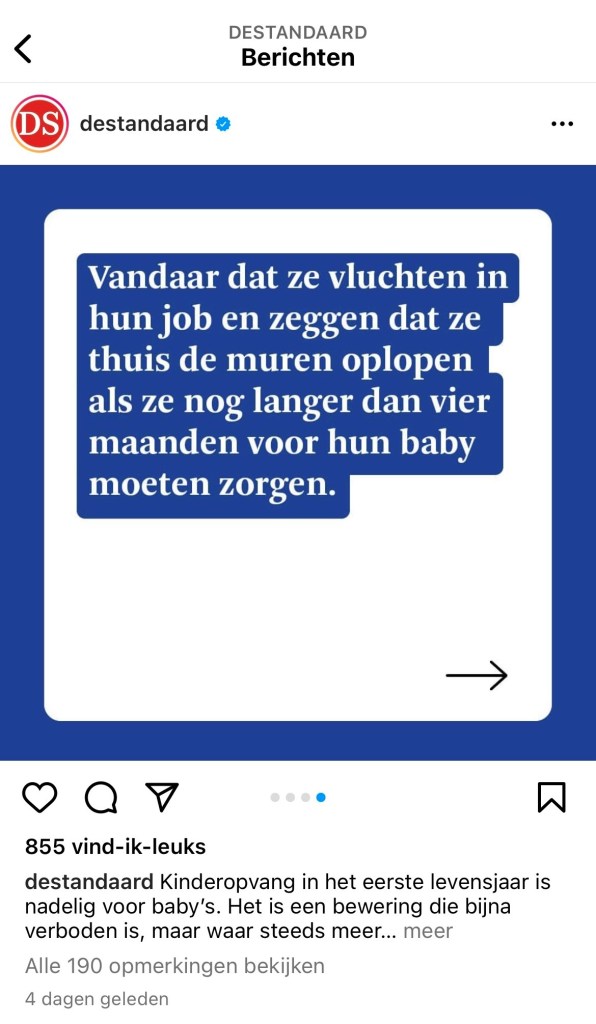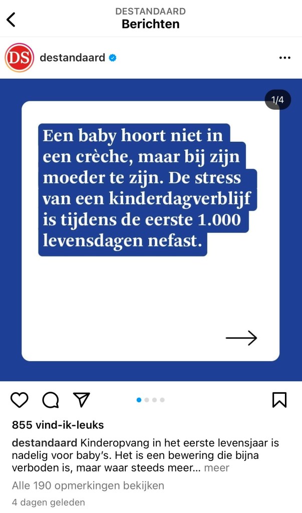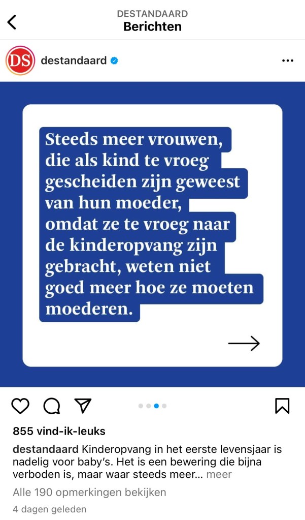 In een update van De Standaard van 31/03 op Instagram werd de huidige “onkunde om te moederen” door vrouwen die “vluchten in het werk” gekoppeld aan het feit dat vrouwen als baby zelf te vroeg in kinderopvang zouden zijn geplaatst…
